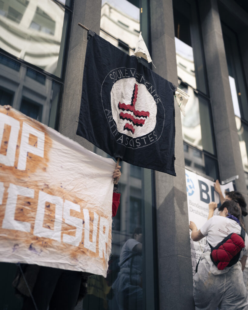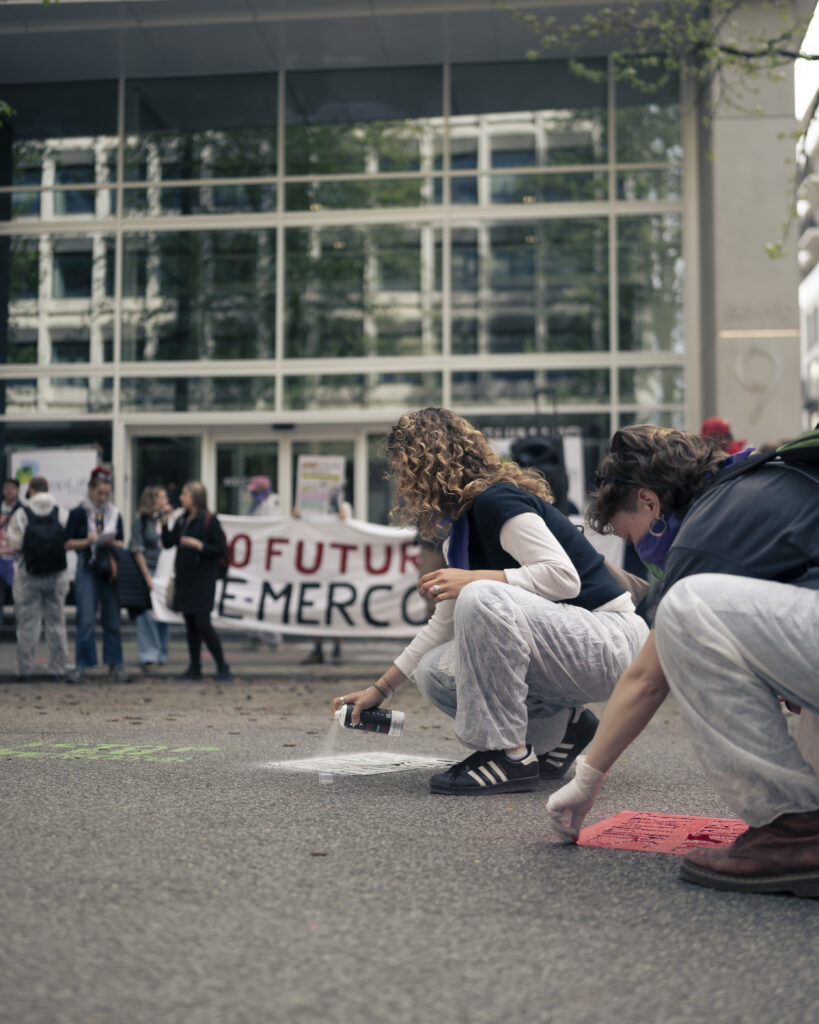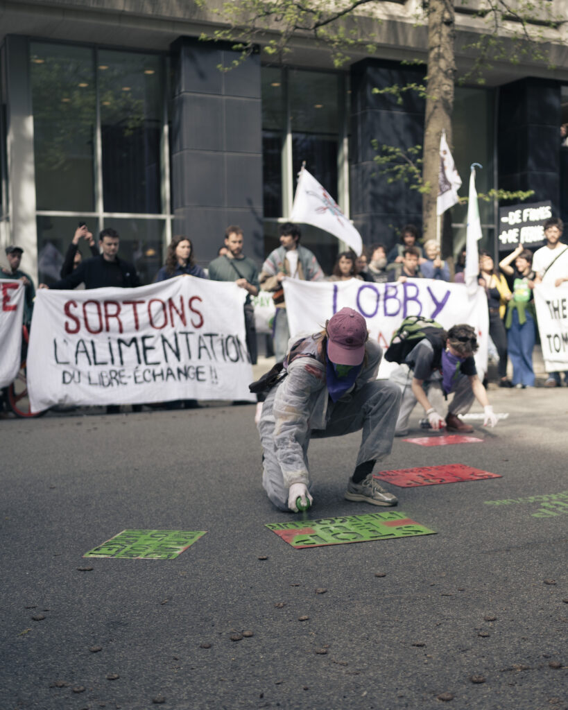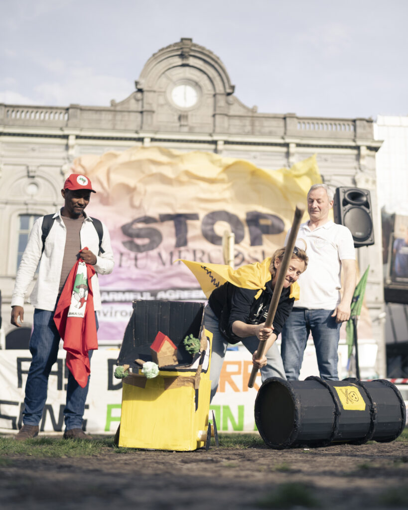Ce vendredi 17 avril, dans le cadre de la journée internationale des luttes paysannes, plusieurs centaines de personnes ont défilées dans les rues du quartier européens à Bruxelles. Les manifestant·es souhaitaient cibler y cibler les acteurs bénéficiaires de l’accord UE-Mercosur, notamment les lobbies des industries agrochimiques et des producteurs de pesticides. Des actions visuelles et des prises de parole ont rythmé le parcours. À l’arrivée, une gigantesque banderole « Stop UE-Mercosur » a été déployée devant le Parlement européen.