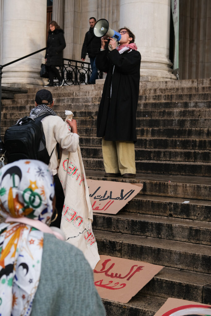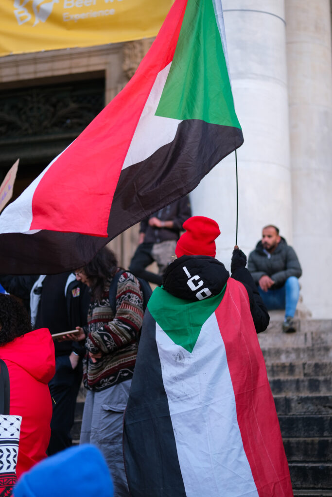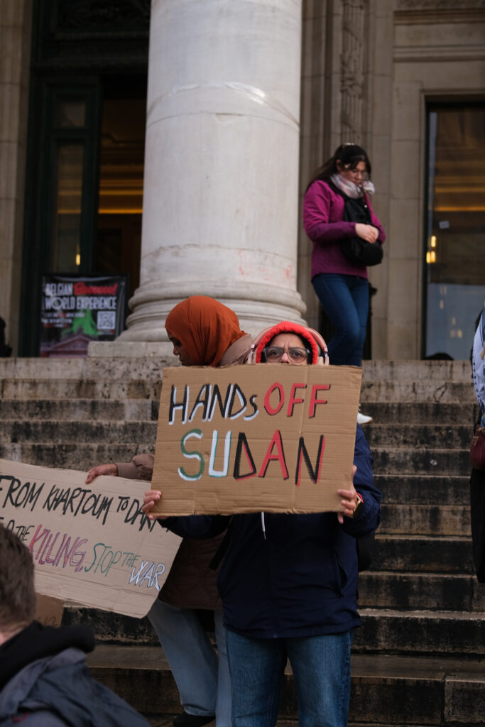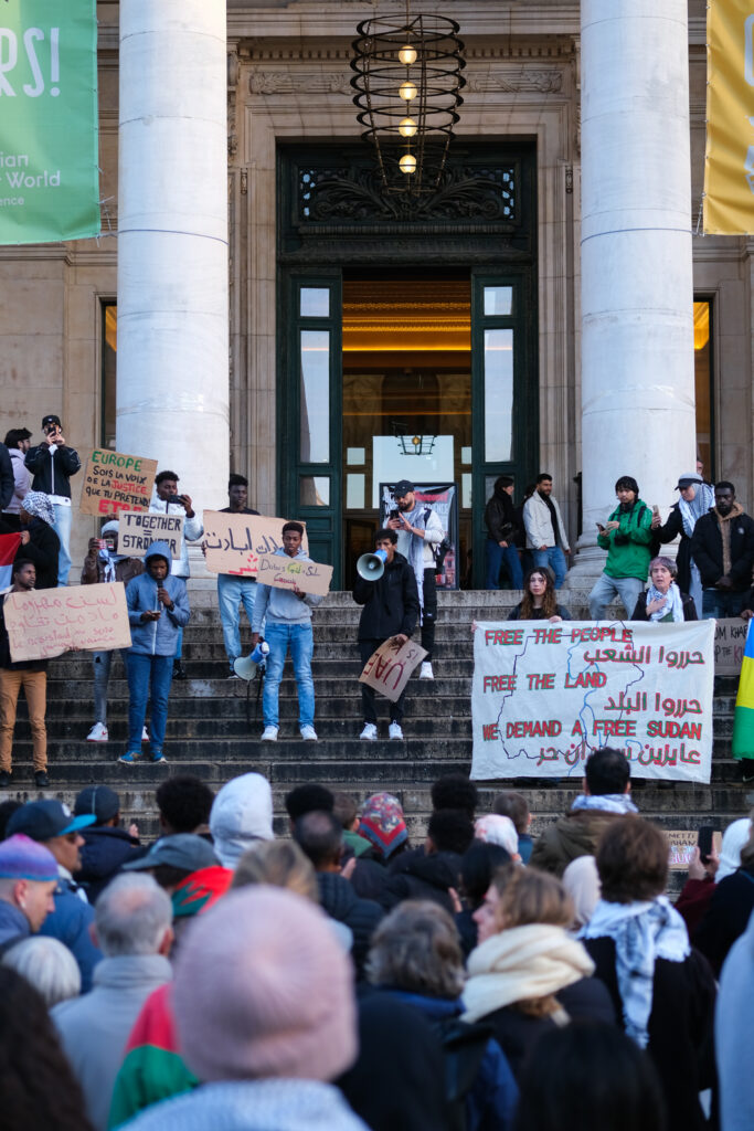 Les manifestant·es Ă la Bourse dĂ©noncent la complicitĂ© de la Belgique et de l’Europe, Ă travers leurs liens avec les Emirats Arabes Unis, principaux soutiens militaires des FSR, ainsi que le business de l’armement et leurs politiques migratoires criminelles.